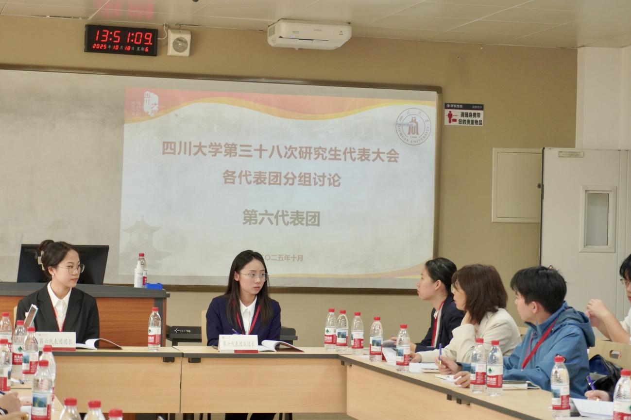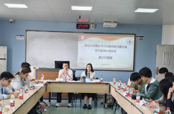 13点30分,各代表团在分会场开展分组讨论。各代表团学习了校党委副书记刘晓虎教授的讲话精神,讨论了《四川大学第三十七届研究生会工作报告》,并就四川大学第三十八次研究生代表大会委员会委员候选人情况和四川大学第三十八届研究生会主席、副主席候选人情况进行讨论。分组讨论会议结束后,各代表团团长汇报分组讨论情况,草拟形成《关于四川大学第三十八次研 究生代表大会的决议(草案)》。随后,各代表团对《关于四川大学第三十八次研究生代表大会的决议(草案)》进行了讨论,并拟于第二次全体会议上进行表决。