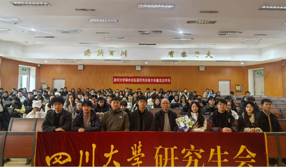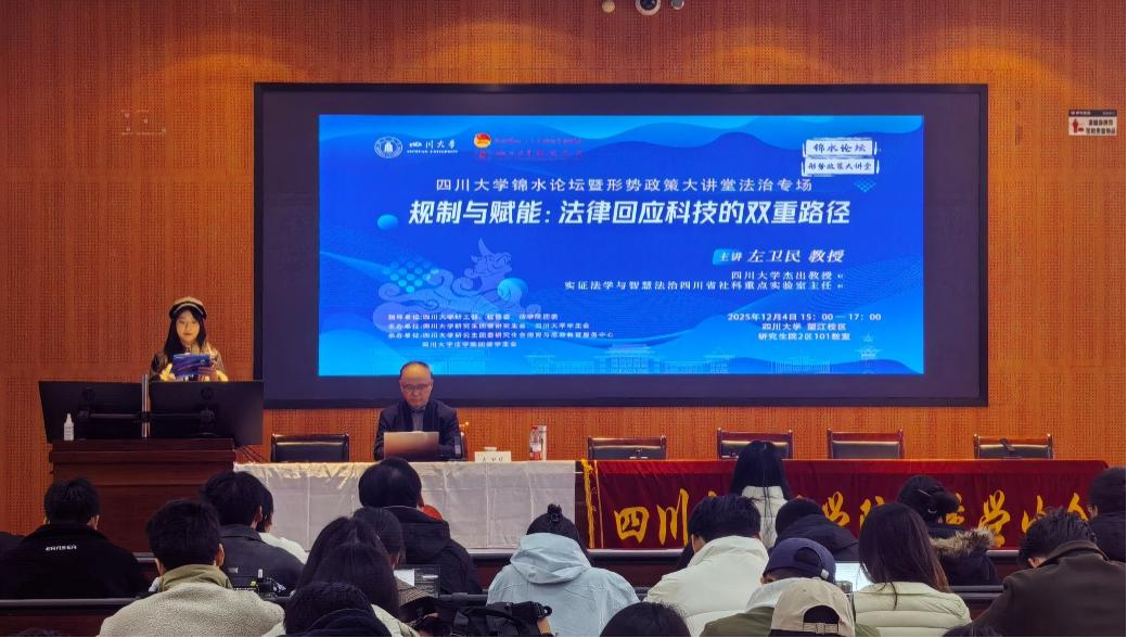 2025年12月4日,正值第十二个国家宪法日。为深入贯彻党的二十届四中全会关于建设更高水平法治中国的战略部署,主动响应国家“人工智能+”行动号召,全面提升我校师生在数字时代的法治素养与前沿科技伦理认知,在研工部、校团委、法学院团委的联合指导下,由研究生团委研究生会、学生会主办,研究生团委研究生会德育与思政教育服务中心、法学院团委学生会共同承办的四川大学“锦水论坛”第87期暨“形势政策大讲堂”法治专场,于当日15:00至17:00,在望江校区研究生院二区101水上报告厅成功举办。