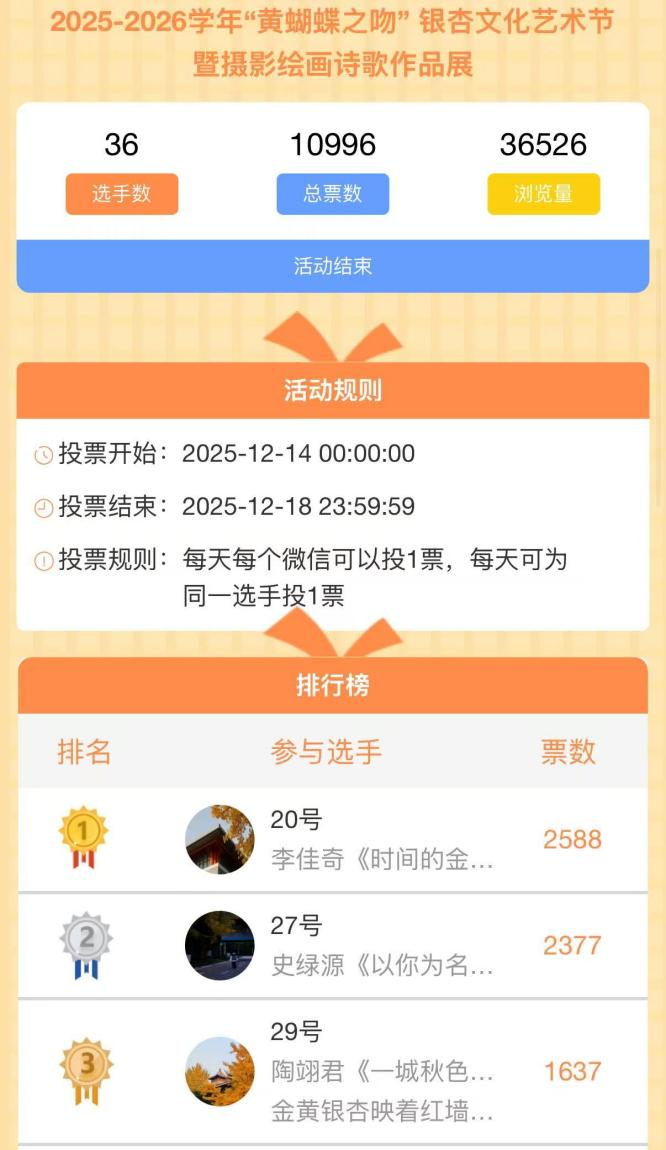 近日,由四川大学研究生工作部主办、四川大学研究生团委研究生会承办为期近一个月的“黄蝴蝶之吻——银杏文化艺术节暨摄影绘画诗歌作品大赛”顺利收官。本次大赛以“金叶飞蝶,银杏作诗”为主题,吸引了华西校区众多硕博研究生积极参与,他们运用镜头、画笔与诗句,共同谱写了一曲属于四川大学银杏的冬日赞歌。