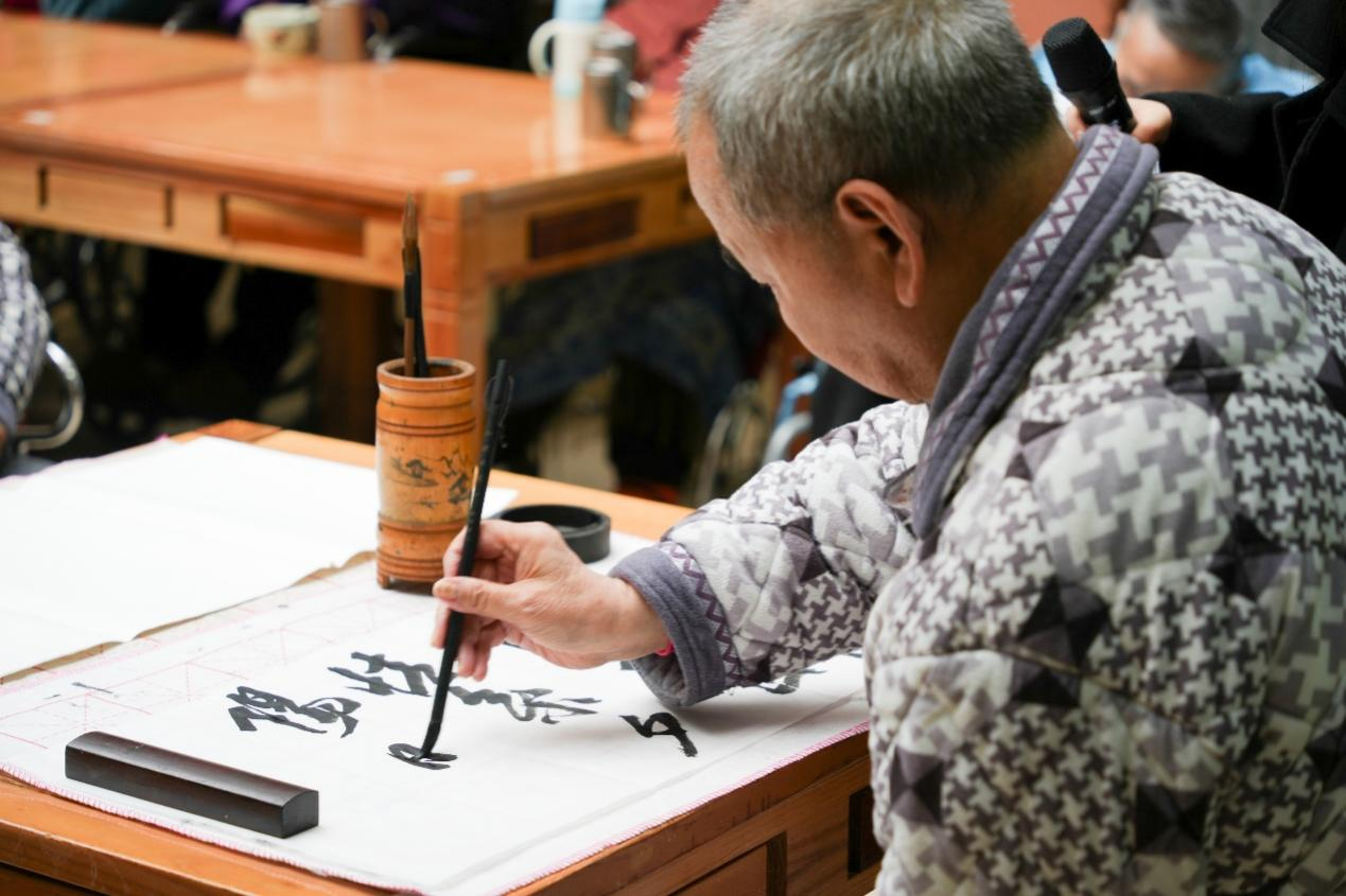 活动伊始,温馨的氛围便被养老院朱钦德爷爷的书法展示推向高潮。作为养老院里的“书法达人”,朱爷爷挥毫泼墨,笔锋遒劲地写下本次活动主题“华西口腔护齿,情系夕阳暖冬”,苍劲的字迹不仅展现了老一辈的风采,更传递着对口腔健康的期盼。令人动容的是,朱爷爷还将自己坚持参与养老院早操活动积攒的积分卡兑换成小礼物,亲手送给现场志愿者,用质朴的行动回应这份双向奔赴的温暖。