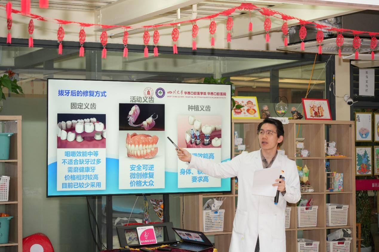 科普宣教环节,华西口腔医学院口腔修复学专业2024级博士研究生饶思晗以牙周炎防治为核心,为现场老人、家属及护工、社工带来了一场通俗易懂的健康讲座。他结合老年群体口腔特点,用图文并茂的演示、生动形象的比喻,详细讲解了牙周病的危害、义齿清洁保养技巧、冬季口腔护理重点等实用知识,针对“如何正确清洁义齿”“牙龈出血该怎么办”等常见问题进行细致解答,让专业知识变得 “一听就懂、一学就会”。
