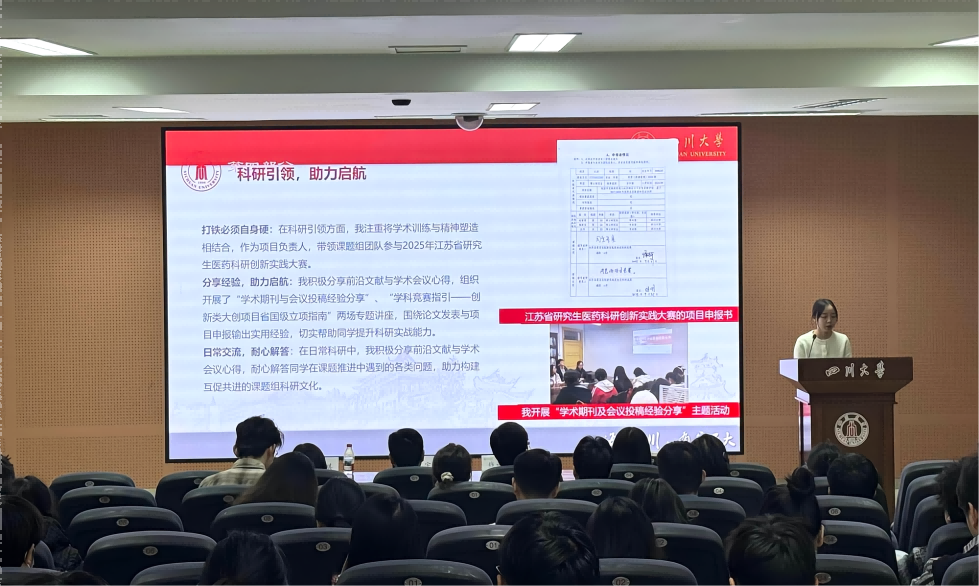 华西临床医学院2025级博士研究生胡钰楠以“坚守精神内核,践行党员本色”为主题展开分享。他立足自身专业,通过临床经验交流、医学科普传播、医工交叉课题实践等具体案例,生动呈现了作为一名党员学长在思想引领、专业服务、科研帮扶等领域为同学们服务的故事。他强调亮明党员身份的重要性,倡导以广泛参与交流拓宽视野,提出借助现有平台开展跨专业服务与科研合作的建议,传递出党员学长无私奉献、服务群众的精神追求,为新一届学长树立了榜样。最后,他引用“我将无我,不负人民”这一共产党人的最高人生境界与大家共勉。