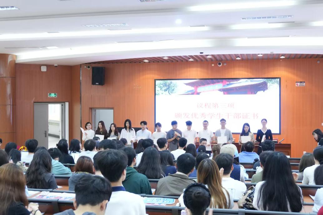 会议在庄重热烈的氛围中拉开帷幕,全体参会人员庄严站立、奏唱国歌。随后主持人分别介绍出席会议的三位指导老师,由郭潇蔓老师分别和贾瑞琪老师为四川大学研究生团委研究生会2024-2025学年任职的学生干部颁发学生干部任职证书和优秀学生干部证书。一份份证书,既表达了对上一届优秀学生干部工作的充分肯定,又承载着对新一届学生干部的殷切期望。