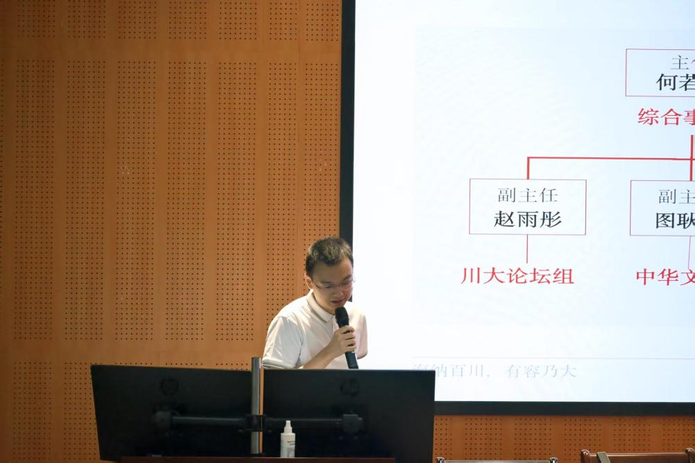 何家琪同学就学术交流服务中心和科技创新服务中心的相关工作进行了介绍。他表示要将优质资源整合,助力川大学子在各类学术交流活动中提升个人能力、实现学术理想,努力营造“科技引领未来,创新驱动发展”的良好学术氛围。