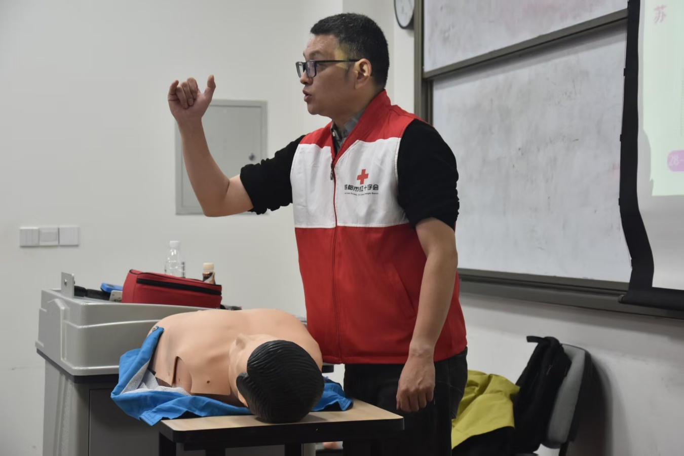 本次活动我们邀请了成都市红十字会专业团队,为50名积极报名的在校同学带来了一场CPR(心肺复苏)与AED(自动体外除颤仪)的硬核技能培训。
