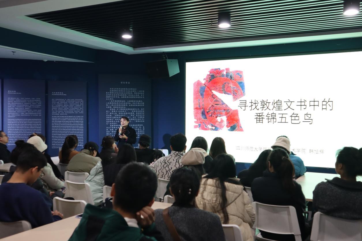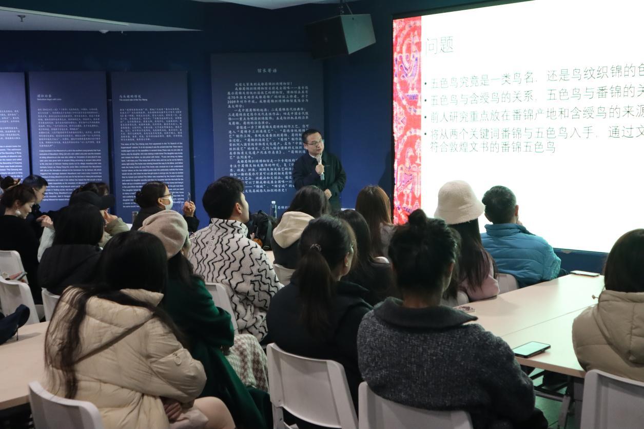 活动伊始,同学们在博物馆讲座厅聆听了题为《寻找敦煌文书中的番锦无色鸟》的专题讲座。主讲嘉宾韩旭辉老师详细讲述了五色鸟如何串联唐蕃贸易、文化交融,成为丝绸之路上的鲜活见证,让千年织锦“开口说话”,还原了一段被纹样记录的东西方交流史。