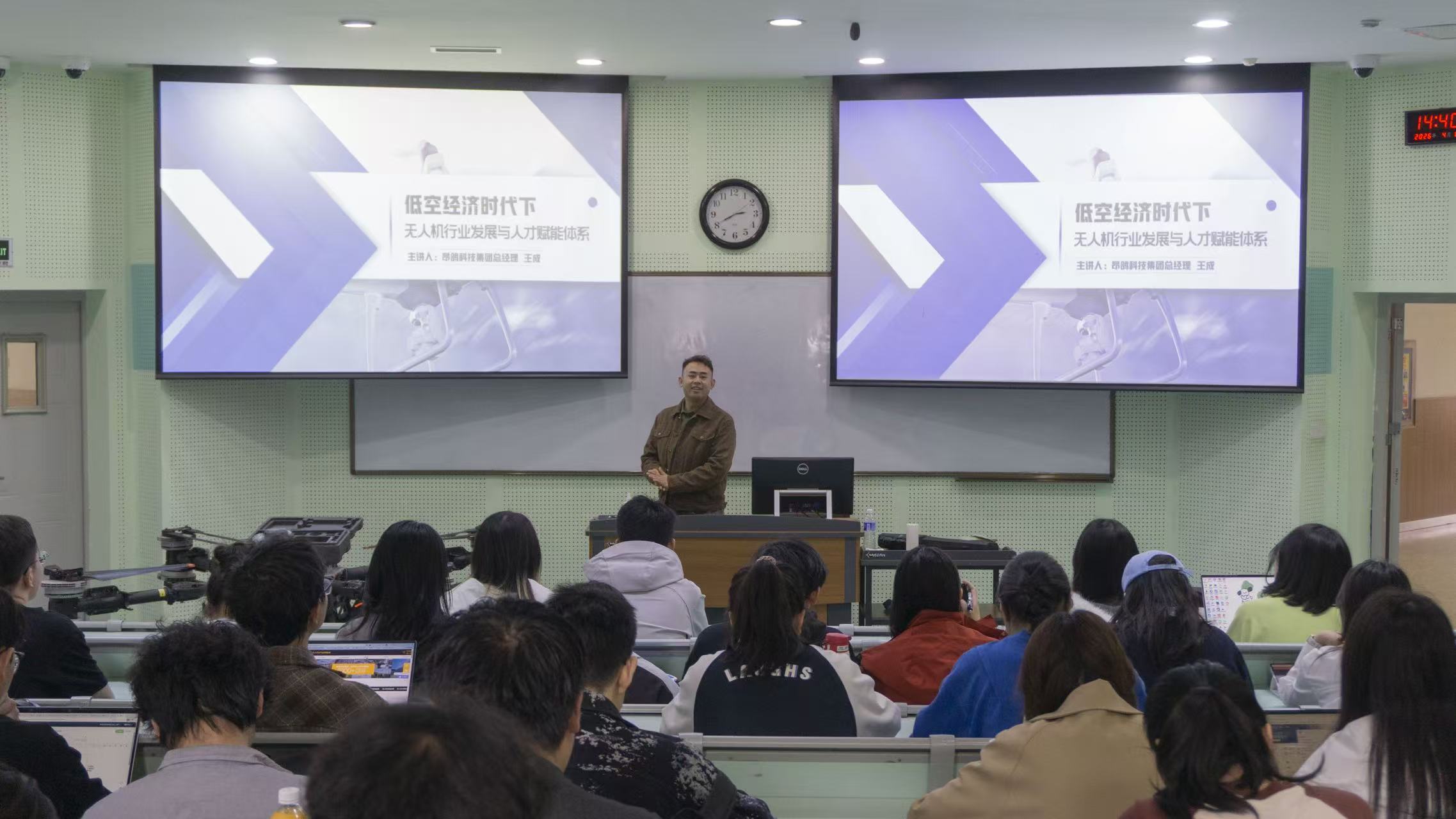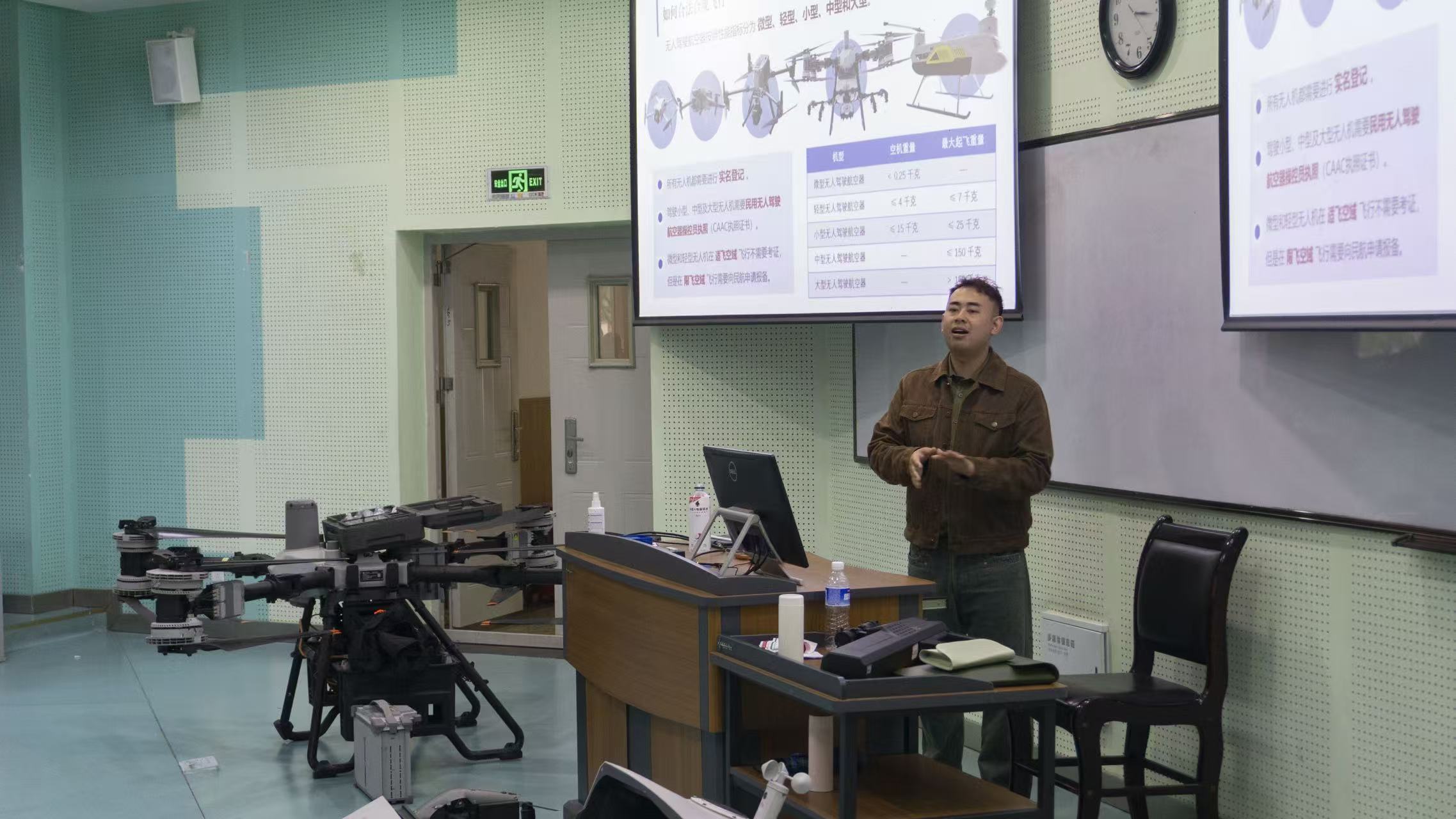 接着,围绕“为什么无人机是当下的黄金赛道”,王成老师通过详实的数据案例展现了无人机千亿级市场的驱动力。此外,王成老师现场展示了无人机实体,并播放了多款大中小型无人机的实际作业视频,内容涵盖测绘勘察、农业植保等多个应用场景。他逐一讲解了各机型的技术参数与科研适配性,演示了如何在合规前提下利用航拍技术采集实验数据,让同学们直观感受到无人机技术在服务科研创新中的实际应用。